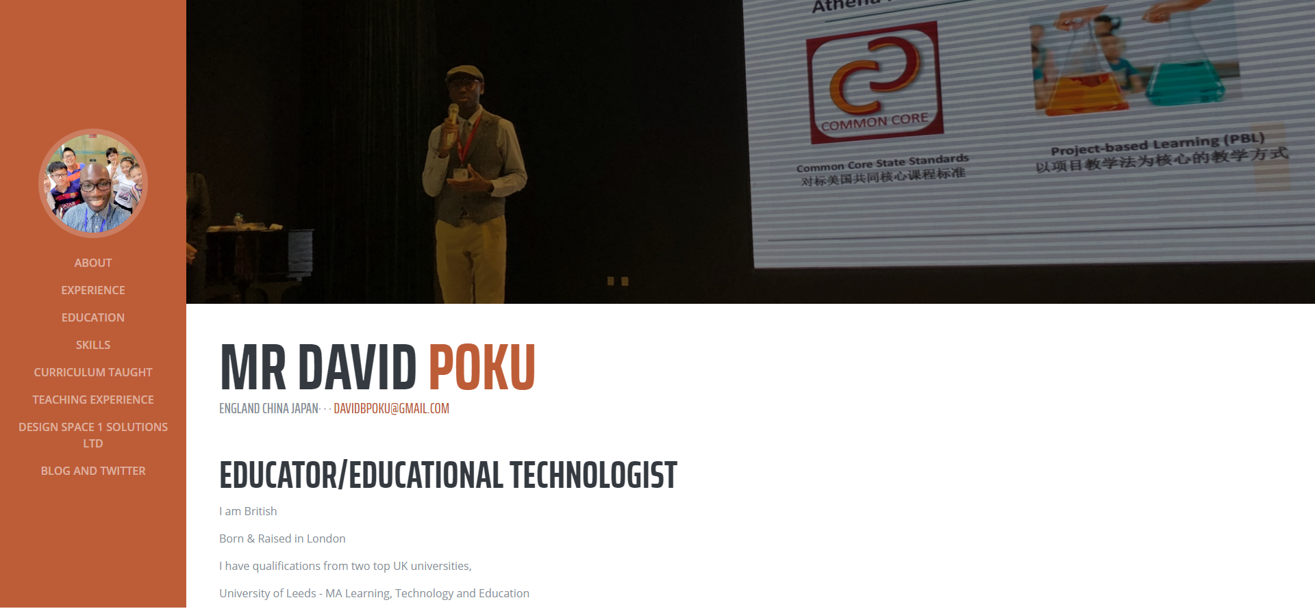 This site has been made to showcase my web dev skill set, HTML, CSS, and JavaScript. I have over five years of teaching experience within the UK, Japan and China, I hold an MA in technology education and learning, BSc Web Design and Development and , Teaching English as a Foreign Language certification.